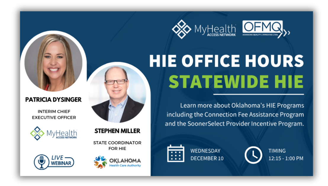 Join us on Wednesday, December 10, 2025, from 12:15 to 1:00 PM CT for a special HIE Office Hours session on the Benefits of Oklahoma’s Statewide Health Information Exchange (HIE) and the latest updates on OKSHINE programs.