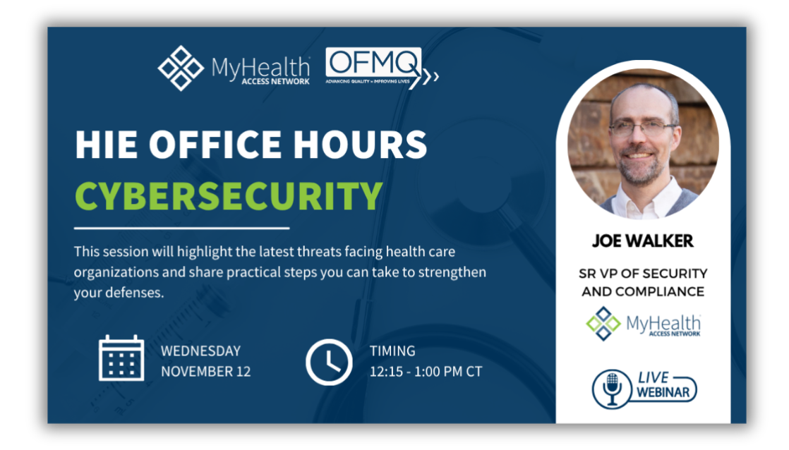 Join us on Wednesday, November 12, 2025, from 12:15–1:00 PM CT for an engaging session on Cybersecurity, presented by MyHealth’s Joe Walker.