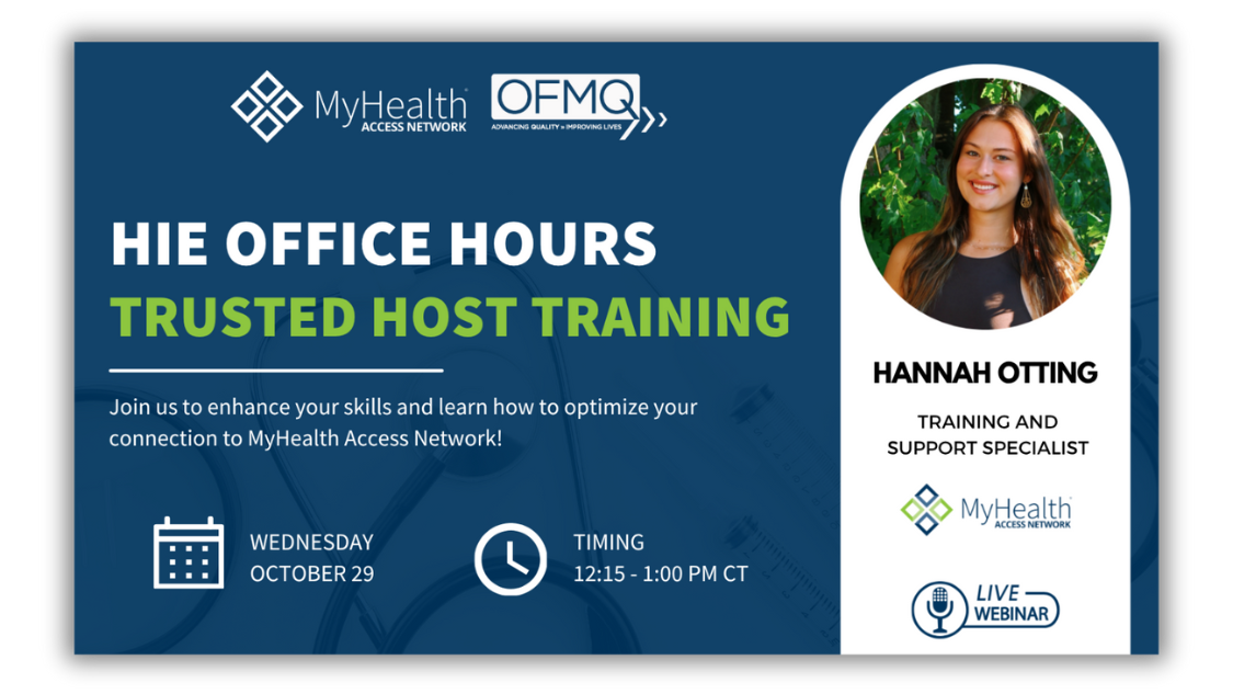 Join us on Wednesday, October 29, 2025, from 12:15 to 1:00 PM CT for a special HIE Office Hours session focused on the MyHealth Provider Portal. This session, led by Hannah Otting, Training and Support Specialist at MyHealth Access Network, will provide role-based training designed to help you make the most of the portal’s powerful features.