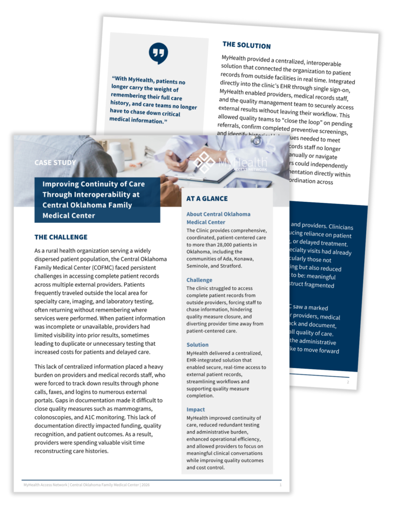 Serving a widely dispersed rural population, Central Oklahoma Family Medical Center faced ongoing challenges accessing complete patient records when patients received care outside the local area. Through interoperability with MyHealth, COFMC gained real-time access to external records directly within their EHR, reducing administrative burden, closing quality gaps, and allowing providers to focus on meaningful, patient-centered care rather than chasing information.