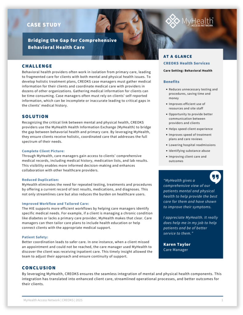 Behavioral health providers often lack real-time visibility into their clients’ physical health, creating gaps in care coordination. CREOKS uses the MyHealth Health Information Exchange to bridge behavioral and primary care, giving care managers access to comprehensive medical histories, medication lists, and lab results. With a complete view of both mental and physical health, CREOKS can reduce duplicate testing, improve care planning, enhance patient safety, and deliver more coordinated, holistic care that leads to better outcomes for the clients they serve.