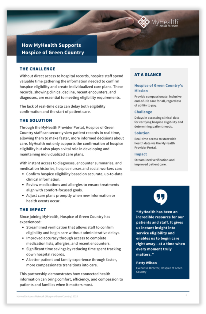 Hospice of Green Country relies on timely, accurate clinical information to confirm hospice eligibility and begin care without delay. Without real-time access to hospital records, staff previously spent valuable time tracking down documentation needed to support individualized care plans. Through the MyHealth Provider Portal, Hospice of Green Country can securely access statewide patient records in real time, enabling faster eligibility verification, better-informed care decisions, and more compassionate transitions into end-of-life care when every moment matters.