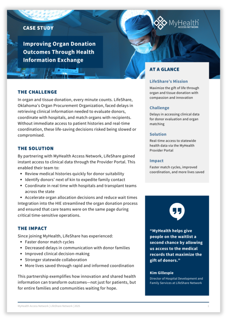 In organ and tissue donation, every minute matters. As Oklahoma’s Organ Procurement Organization, LifeShare faced delays accessing the clinical information needed to evaluate donors, coordinate with hospitals, and match organs with recipients. Through real-time access to statewide health data via the MyHealth Provider Portal, LifeShare accelerated donor evaluation, improved coordination across care teams, and reduced wait times—helping ensure more lives are saved and the gift of donation is maximized.