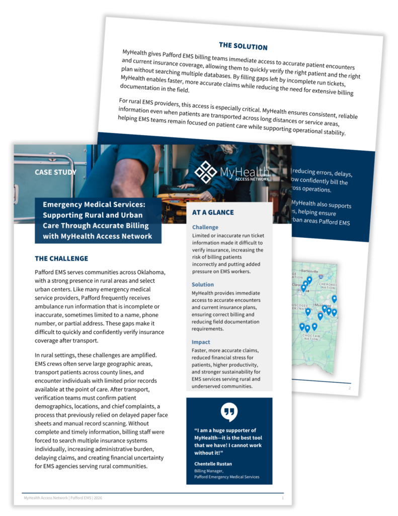 Serving communities across Oklahoma with a strong rural presence, Pafford EMS faced persistent challenges verifying insurance due to incomplete or inaccurate ambulance run information. In rural settings where transports span long distances and cross county lines, these gaps increased administrative burden and delayed billing. With MyHealth, Pafford EMS gained immediate access to accurate patient encounters and current insurance coverage, enabling faster, more reliable claims, reducing financial stress for patients, and supporting the long-term sustainability of EMS services in rural and underserved communities.